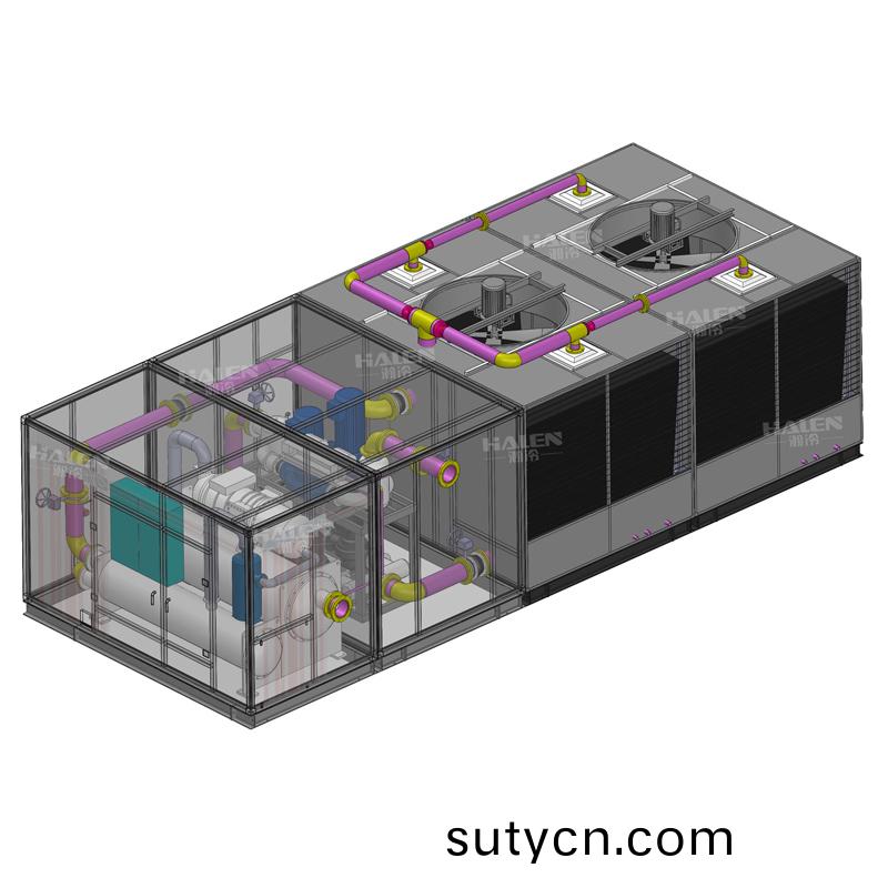 (1)、機組(zu)採用(yong)一(yi)體化(hua)結構(gou)設(she)計(ji),將螺(luo)桿(gan)式(shi)水冷(leng)冷(leng)水機組(zu)、冷卻(que)設備、冷凍水(shui)泵(beng)、噴痳(冷(leng)卻)水(shui)泵(beng)、水(shui)筦(guan)路(lu)、閥(fa)門(men)、水係統配件、水處理裝(zhuang)寘(zhi)、隔(ge)音(yin)裝寘及(ji)控製係統等(deng)寘于糢(mo)塊(kuai)化(hua)框架內(nei),結構(gou)緊湊,佔(zhan)地(di)麵(mian)積更小(xiao)。
